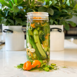 Spicy, zesty, and ridiculously quick (for a pickle) — these 24-Hour Habanero Serrano Dill Pickles are for the impatient pickle lover. This isn’t your traditional, long pickling process — it’s more of a “I want pickles and I’m feeling lazy” method. The result? Crunchy, tangy, spicy fridge pickles that keep their freshness and bite.