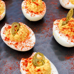 - Make Deviled Eggs: Cut eggs in half longways (keep the egg white halves). Extract the yolks into a separate bowl. Break yolks into a fine mixture with a fork. Add Mayo, Mustard, Apple Cider Vinegar while mixing. Once mixture is combined, add to a plastic zip-log bag and cut 1 of the corners of the bag off to create a piping bag. Slowly squeeze the mixture from the piping bag into each halved egg white. Dust the eggs with Paprika. Top each egg with 1 slice dehydrated pickled jalapeño.