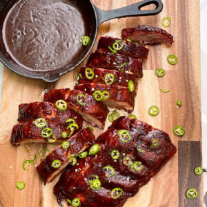 - Remove ribs from smoker and place on cutting board, let sit for 5-10 minutes. Cut ribs into single bones and, if using, top with sliced Serrano peppers for garnish. Best served with remaining sauce heated on the side.