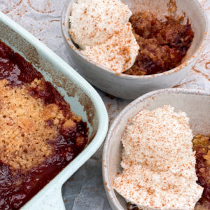 Growing up, my family always had rhubarb in the backyard, and each summer we’d celebrate its return with this cozy crisp. Now I’ve carried on the tradition by growing rhubarb in my own garden — though store-bought works just as well. Whether warm with ice cream or cold for breakfast (no judgment here), this recipe captures that perfect sweet-tart bite of summer.
