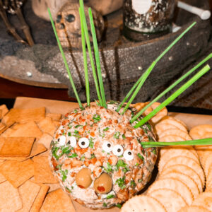 When you’re ready to serve, unwrap the cheese ball and place it on a platter. If you’re in the Halloween spirit, go ahead and give it a little personality — add olive eyes, chive “hair,” or whatever monster features your creativity dreams up. - Serve and enjoy.